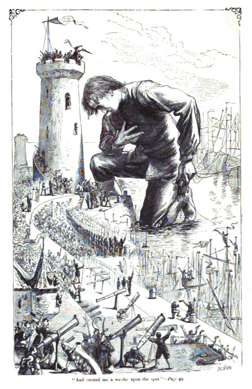 Here Gulliver was given the honour of ‘nardac’ for his work in the war between Lilliput and Blefuscu. Gulliver kneels before the Emperor of Lilliput, who stands on top of the lighthouse, holding a sword. Gulliver is still in the water, and a crowd gathered to see the spectacle. The honour of nardac is the highest honour for Lilliputians.