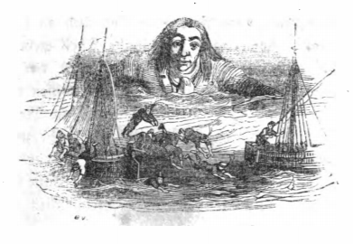 Here we see a depiction of the war between Lilliput and Blefuscu. In the foreground we see two Blefuscan ships, with the men jumping ship out of fear of Gulliver. These ships are fairly small, as they only have one sail, compared to the multiple sails on the Lilliputian ships shown in other images. Gulliver, who’s head and shoulders are above the water are visible in the background. Gulliver’s participation was what won the war for the Lilliputians. The same image appears in the 1843 Krabbe edition.