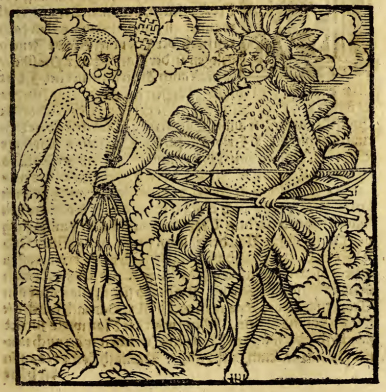 Two Tupinambá men are shown from the front. Both men are adorned with face stones on their cheeks and chins and tattoos or paint in dots all over their bodies. The man on the left wears a large necklace and carries a club decorated with feathers on one end. The man on the right wears a large feathered headdress and feather adornment around his waist and carries a bow and several arrows.