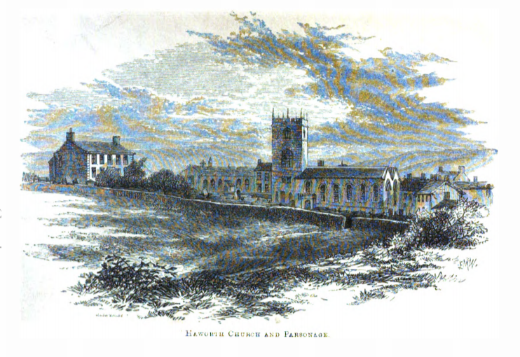 Here we see the Haworth Church and Parsonage in North England. The viewer stands on a hill, looking down into the town where we see the large Gothic church and the parsonage, where the clergy would live, is seen on the hill, slightly above the church. The image is shown looking down towards the town, as both Wuthering Heights and Thrushcross Grange are large estates outside the town.