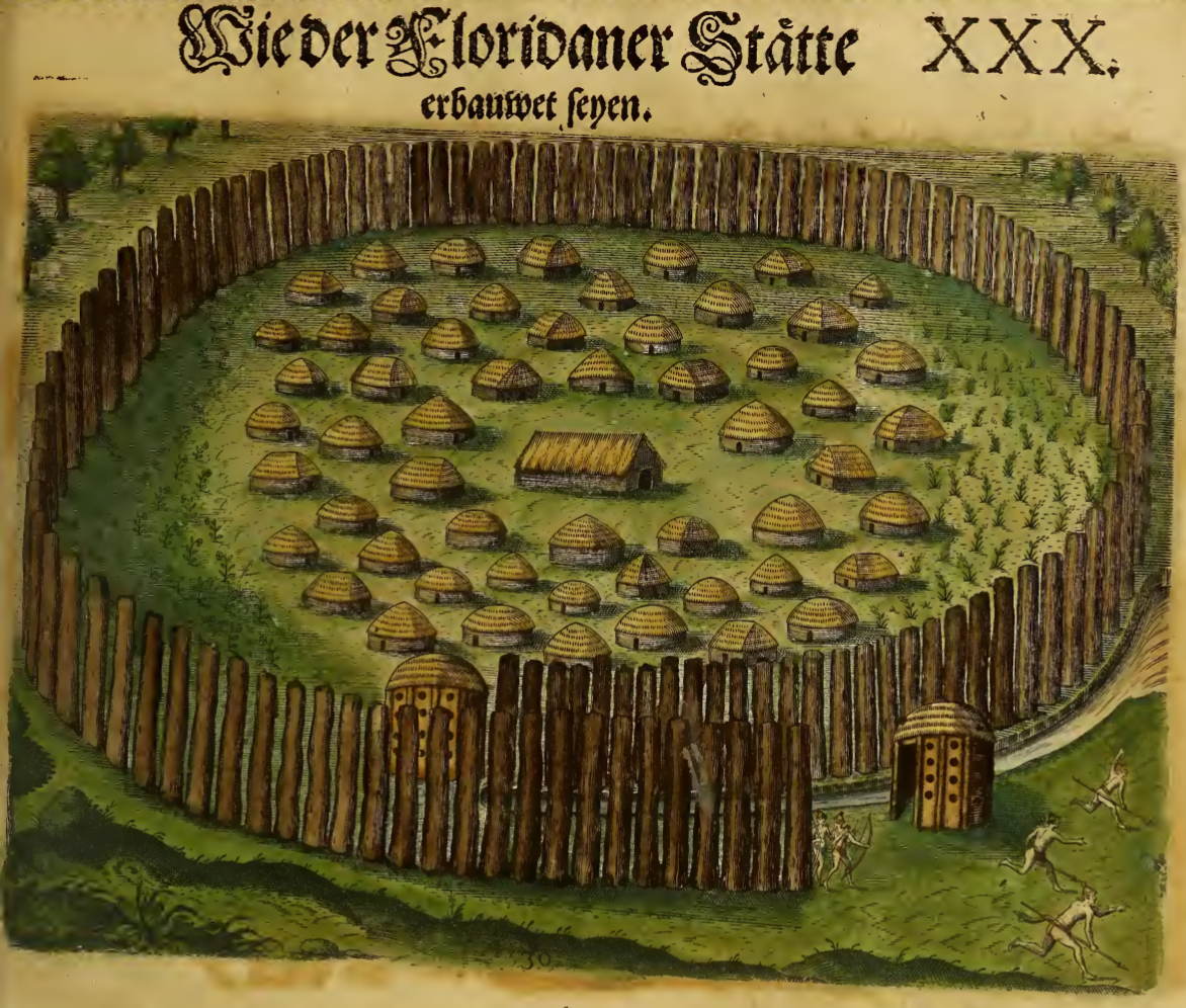 An Indigenous town is shown. The town is surrounded by large logs stuck into the ground, forming a large fence with one entrance. At both the exterior and interior of the gap there is a tall hut. Inside the fence, many round structures sit in a cluster. At the center of the cluster is a larger rectangular building. This illustration is identical to the one found on page 101 of Frankfurt 1591, but colored.