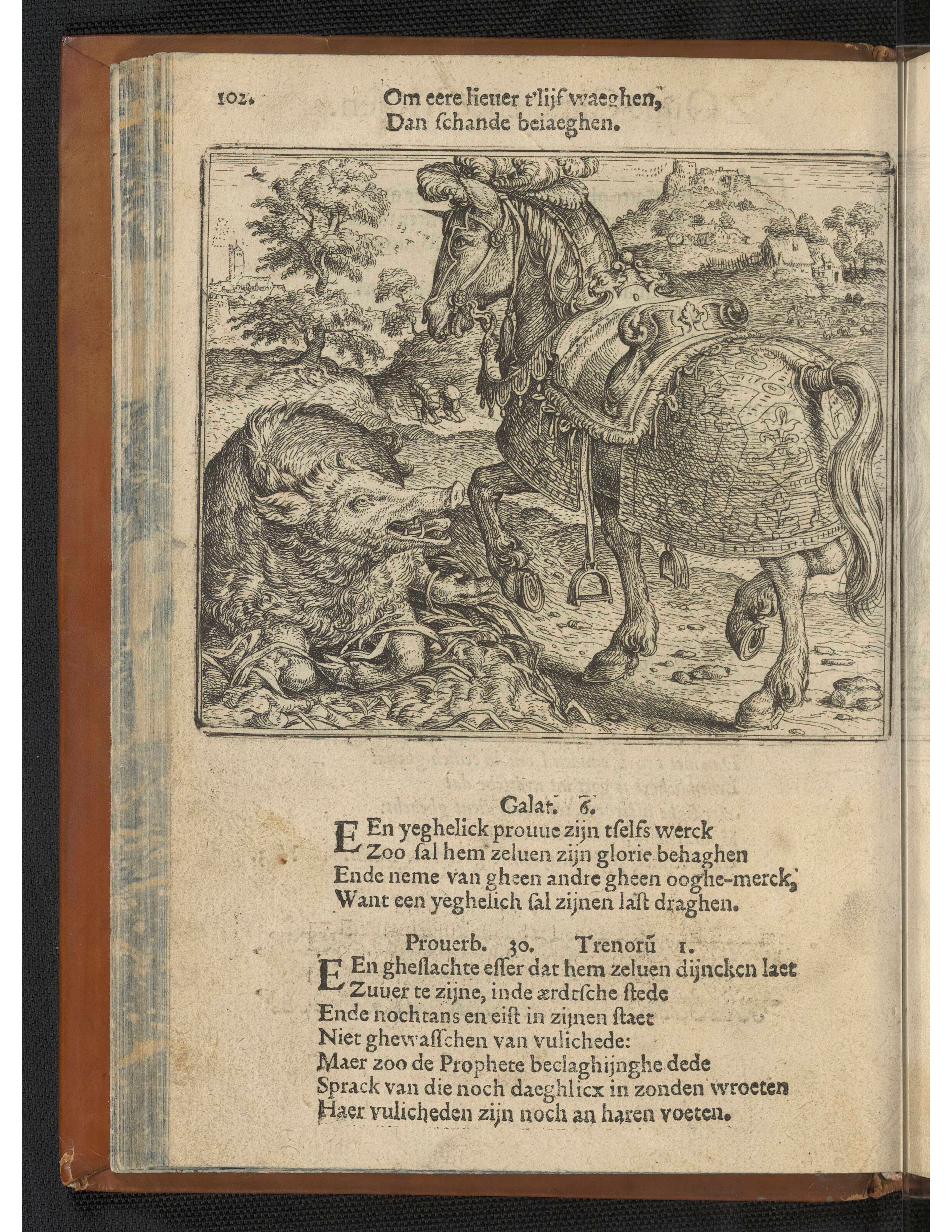 - The boar and the war horse'; a boar lying in hay at left; a war horse standing at right; Dutch letterpress on verso; illustration to Eduwaert de Dene's edition of Aesop's Fables, "De Warachtighe Fabulen der Dieren"