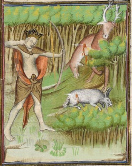 This illumination depicts Camilla, the daughter of King Metabus, hunting animals in the forest in order to make clothing out of their fur and skin. Camilla had been raised in the forest by her father after he was exiled from their kingdom. She set aside common womanly duties and devoted herself to hunting and preserving her chastity. She is illustrated wearing a cloak made from animal fur, as well as a crown to symbolize her royal status. Due to her strength and fearlessness, the Volscian people eventually summoned her back in order to be queen.