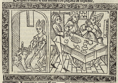 This engraving depicts two separate scenes. The right side of the engraving depicts queen Cleopatra of Egypt sitting at a dinner table, with her husband Antony beside her. Cleopatra had very expensive tastes and demanded a feast which would cost an outrageous amount of money. When Antony did not provide the entire feast Cleopatra demanded, she took out one of her pearl earrings and dissolved it in her drink and drank it to get the luxuriousness she desired. Cleopatra is depicted drinking the pearl in this image. The names Cleopatra and Antony (written as “Antonius”) are engraved beside their heads. There is a third figure in this scene, which is a man named Lucius Plautus who was called to be a judge of the feast. The left side of the engraving depicts the suicide of Antony. After realizing the forces of Octavian were on their way to destroy them, Antony plunged his sword into his chest, as depicted in the engraving. Cleopatra is depicted kneeling over his body before she kills herself as well.