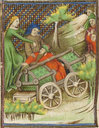This illumination depicts a vestal virgin named Claudia. She is depicted grabbing onto a man wearing a brown shirt and a blue head wrap while hitting him. Her father was a noble man who, under the order of the senate, rode through a populous area of Rome on a chariot for a triumph procession. A man had run up to Claudia’s father in a rage and was about to attack him, but not before Claudia put herself in front of the man to protect her father. The man in the blue head wrap is illustrated grabbing on to Claudia’s father and attempting to drag him out of the chariot while Claudia attacks the plebeian. Boccaccio explains Claudia is praiseworthy due to her devotion to her father and for her actions of risking her life for him.