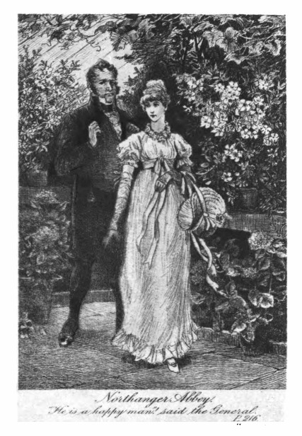 Here we see Catherine Morland and General Tilney walking through the gardens at Northanger Abbey. Catherine was invited to Northanger Abbey by Eleanor Tilney and her brother, Henry Tilney, after becoming close friends in Bath. This scene occurs shortly after Catherine's arrival, when General Tilney took Catherine on a tour of the property. This scene occurs in chapter 22 on page 216 as noted underneath the title of this image. The characters are shown in the traditional regency style, with General Tilney wearing waistcoat and tailcoat. Catherine wears the regency style dress with an empire waist. Her hair is worn tied up, as was tradition for women after their “coming out” before the queen, signaling her entrance into society. The regency period dated to the early nineteenth century (1811-1820) when George, Prince of Wales, later George IV (r. 1820-1830), reigned as regent for his mentally ill father, King George III (r. 1760-1820). The regency period is associated with the rise of neoclassicism in art and fashion. The same image appears as the frontispiece for the Dent 1893, 1894, 1895, 1896, and 1897 editions of Northanger Abbey.