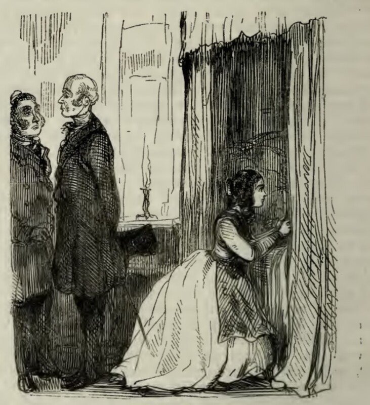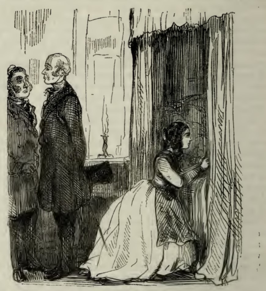 Amelia Sedley kneels by her father’s bedside, holding his hand as they pray together as he dies. Two other men, possibly the doctor and the butler, also stand in the room, but a few steps back from the bed.