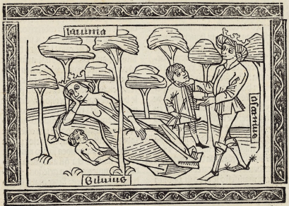 This engraving depicts Lavinia, wife of Aeneas and queen of Laurentum, hiding in the forest with her baby in fear of her step-son, Ascanius. Lavinia had given birth to a son who she named Silvius. Boccaccio explains that after Aeneas died, Lavinia fled to the forest as she was afraid that her step-son would kill her. Lavinia was wrong, and Ascanius voluntarily gave the kingdom of Laurentum back to her and helped raise Silvius. Lavinia’s name is engraved at the top of the illustration, and Silvius’ name is engraved below his body at the bottom of the engraving. Ascanius is pictured on the right-hand side of the engraving with his hand touching a young Silvius’ face with brotherly affection.