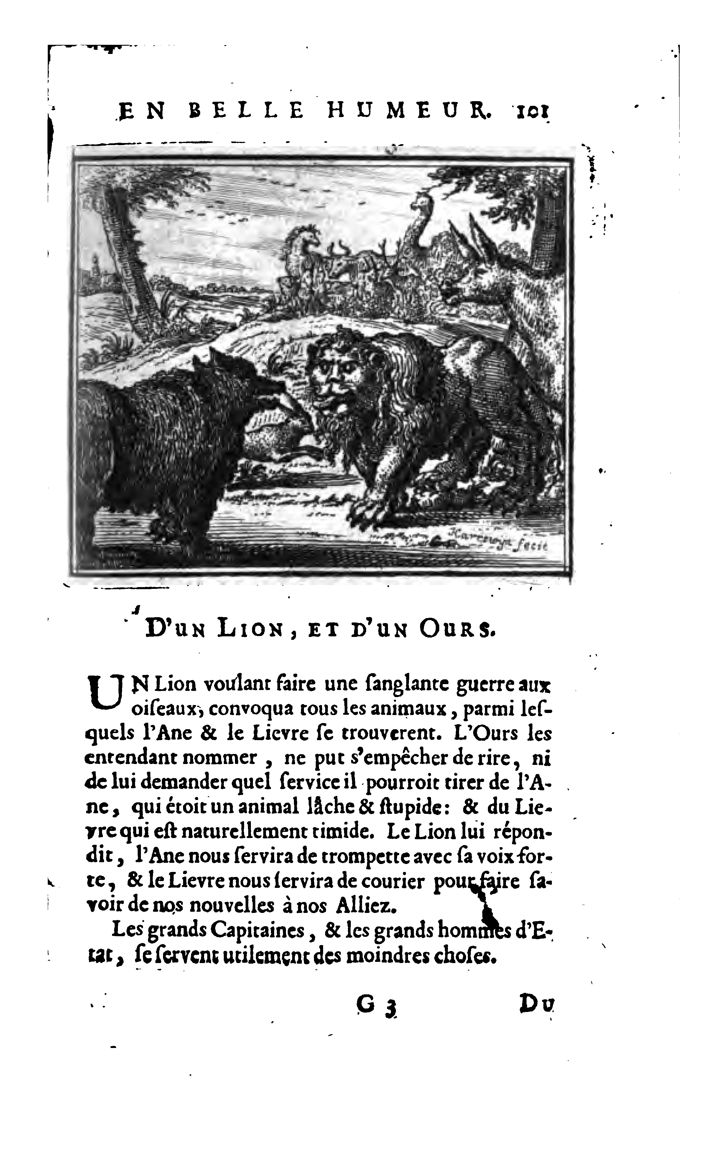 The lion decided all the animals must to go to war with the birds. The image depicts the gathering of all the animals shown in the background. When the bear laughed at the donkey and hare upon seeing them gathered and could not see what use they could be in the war. The lion gives the donkey the job of being a trumpet and the hare the job of being a courier. The foreground shows the bear facing the lion, donkey and hare.