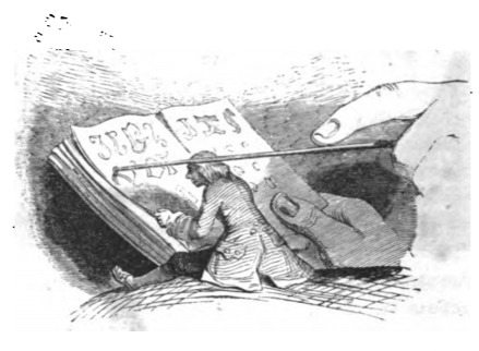 [Glumdalclitch teaches Gulliver to read the language of the giants from Brobdingnag]