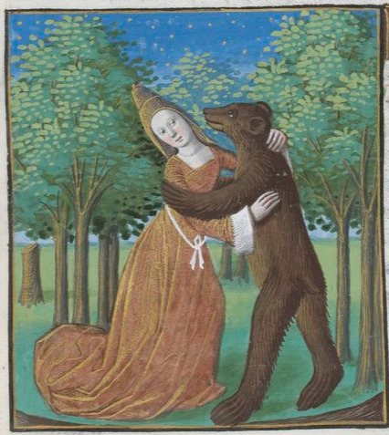 This illustration depicts Zenobia, the queen of Palmyra, wrestling with a bear. Boccaccio explains that Zenobia had cast aside womanly duties and practices and was incredibly strong and independent. She often spent her time in the woods where she would hunt animals such as bears and lions, which is why this illustration depicts her fighting a bear. Zenobia had such strength that when her husband went to war, she hid under her armour and fought alongside him.