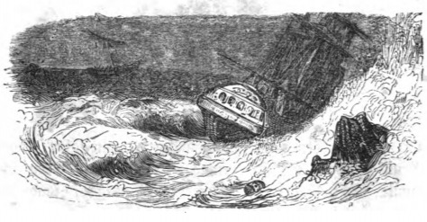 Here we see the shipwreck which resulted in Gulliver’s separation from the rest of the ship, then ending up in Lilliput. The image shows the large wave which overtook the ship, which we see as it tips over into the rough seas. The same image appears in the 1843 Krabbe edition.
