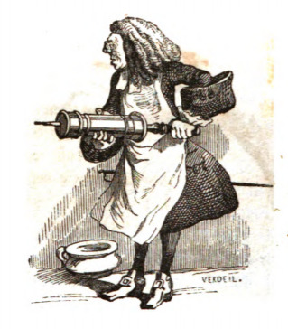 Gulliver explains the various medicines used in England to treat disease. In this image we see a doctor holding a large needle. The image represents a doctor giving a patient an enema. We also see a chamber pot on the floor next to the doctor. The same image appears in the 1843 Krabbe edition.