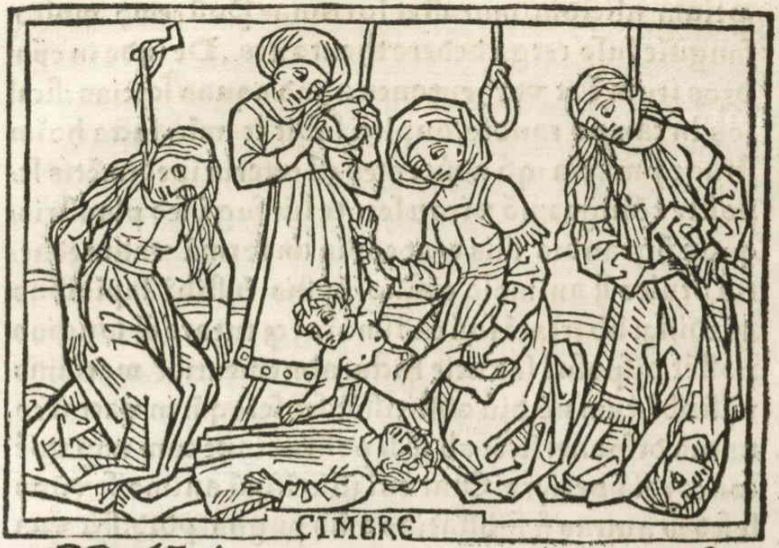 This engraving depicts the wives of the Cimbrians (a northern tribes-people) killing their children and hanging themselves. After their husbands were defeated in war against the Romans, the wives pleaded to their enemies for mercy and to let them become vestal virgins. When the Romans denied their request, they decided to kill their own children and hang themselves to save their virtue and to not die at the hands of their enemies. The word “Cimbre” is engraved at the bottom of the image which translates to the word “Cimbri” (the name of their tribe). Some women in the image are depicted with the nooses around their necks, and one woman is depicted killing her child before killing herself.