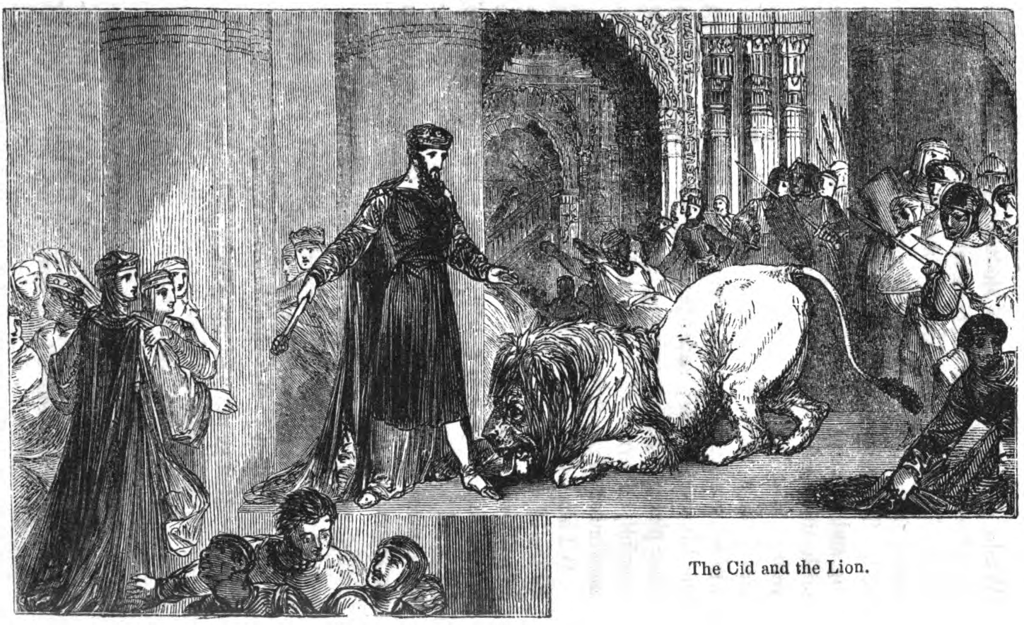 The Cid stands in front of an escaped lion, which has just broken into a room in which he was sleeping. His nephew Don Bermudo and his two sons-in-law were also in there. Bermudo was willing to fight the lion, while the sons-in-law hid, but rather than attack the lion kneeled at the feet of the Cid, apparently miraculously. Though the Cid forgave his sons-in-law for their cowardice, they resented him for it.