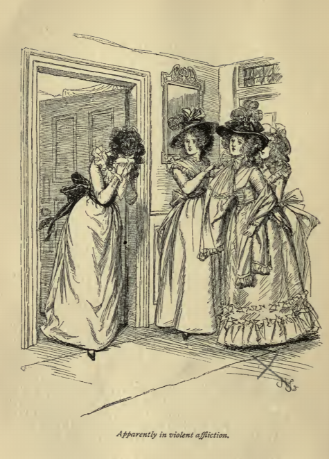 In this image Marianne runs out of the drawing room crying as Elinor, Mrs. Dashwood, and Margaret return home from a walk. In this scene, Willoughby had come to tell Marianne that he had to leave and would likely not be back at Barton Park for another year. Marianne was distraught to hear this, and spent several days crying in her room. This scene occurs in chapter 15. The characters are shown in the traditional regency style, as Marianne, Elinor, Margaret and Mrs. Dashwood wear the regency style dress with an empire waist. Elinor, Mrs. Dashwood, and Margaret wear bonnets, and Marianne hides her face in her handkerchief. The regency period dated to the early nineteenth century (1811-1820) when George, Prince of Wales, later George IV (r. 1820-1830), reigned as regent for his mentally ill father, King George III (r. 1760-1820). The regency period is associated with the rise of neoclassicism in art and fashion.