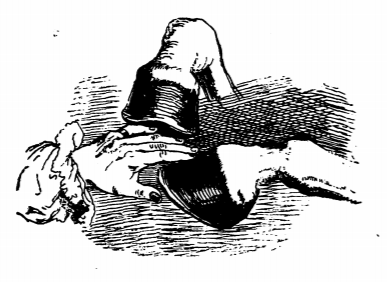 Here we see Gulliver’s master holding Gulliver’s hand between his hoofs. Gulliver explains the difference between his body and his hands to those of females of his species. He explains that although he has nails on his hands and feet, the skin on his hands and feet were too soft to walk on without protection. The same image appears in the 1839 Krabbe edition.