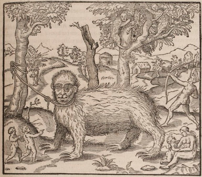 A large animal (the fictional representation of a sloth) stands on the ground, tied to a nearby tree by a rope around its neck. The animal has a bear-like body and a humanoid face, with three toes tipped with large claws on each foot. Two more of the creatures cling to a tree in the background and an Indigenous man aims a bow and arrow towards them. Two Indigenous children stand in front of the tethered sloth and a mother and child sit on the ground near the animal. According to the text, the name of the creatures, Haüt, or Haüthi, comes from the Indigenous name for the trees the sloths were commonly found in. Thevet calls them “beasts that live on air” because no one had managed to observe them eating. This image is identical to one found on page 941 of Paris, 1575 (l’Huillier).