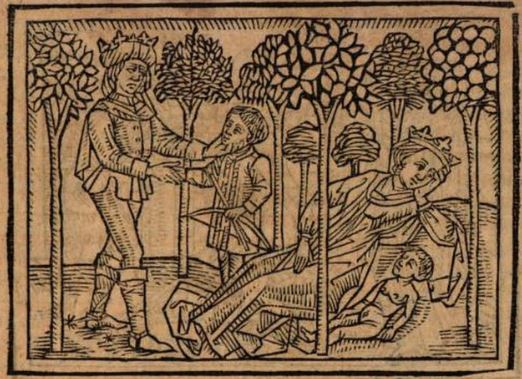 This engraving depicts Lavinia, the wife of Aeneas and queen of Laurentum, hiding in the forest with her baby in fear of her stepson, Ascanius. Boccaccio explains that after Aeneas died, Lavinia fled to the forest as she was afraid that her stepson would kill her and her newborn son, Silvius. Lavinia was wrong, and Ascanius voluntarily gave the kingdom of Laurentum back to her and helped raise Silvius. Ascanius is pictured on the left side of the engraving with his hand touching a young Silvius’ face with brotherly affection.