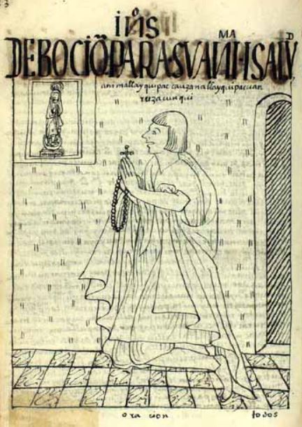 This image depicts an indigenous man kneeling on a tiled floor while looking up to an image of the Virgin Mary as he prays. He is holding a rosary in his hands as he prays. He is illustrated wearing a tunic with a pair of trousers beneath them and a cloak draped over his shoulders. The author explains that the indigenous peoples of Peru should devote themselves to daily praying for their souls, finances, and family. The caption written above the man’s head reads, “animallayquipac cauzanallayquipacuan rrezacunqui” [you must pray for your soul and for your life]. The caption at the bottom of the image reads, “oración” [prayer].