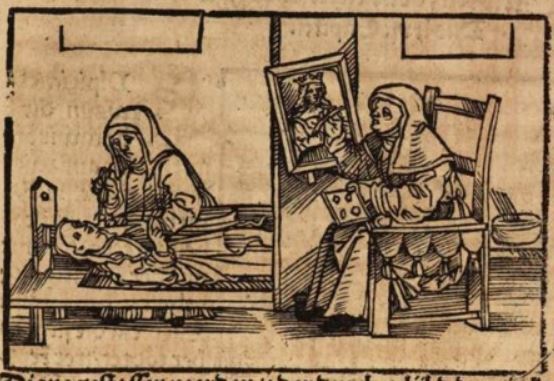 Marcia, a Roman woman who remained a virgin her entire life, is depicted on the right side of the engraving painting a portrait. Boccaccio explains that Marcia is worthy of renown for her chastity and for her painting and sculpting abilities. She is known to have mostly painted and sculpted figures of women, which is why there is a portrait of a woman wearing a crown in her painting. The left side of the engraving depicts Marcia sculpting a figure of a woman.