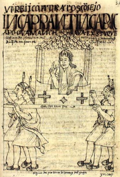 This chapter discusses the system of administrative officials in the Inca Empire. This image depicts Capac Apo Guaman Chaua, the Incap Rantin [Inca’s replacement] and viceroy to the Inca king, riding on his litter to act on behalf of the Inca. The litter is being carried by four figures with two in the front and two in the rear. They are carrying the litter by supporting the wooden posts on their shoulders. The author explains that not only was Guaman Chaua the second person to the Inca, Topa Yupanqui, he was also second to the Duke of Alba in Castile. He was authorized to travel in this litter to any region of the kingdom to represent the Inca. The author also explains that he himself was the grandson of this viceroy Guaman Chaua.