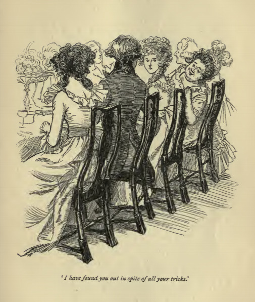 In this image Mrs. Jennings tells Marianne she knows where she and Willoughby had gone that day. Marianne and Willoughby had gone alone to walk through the grounds of Willoughby’s future estate, Allenham. Elinor felt that this excursion was inappropriate because they were not engaged and there was another woman living at the property. Mrs. Jennings tells Marianne this at a dinner hosted by Lady Middleton and Sir John. This scene occurs in chapter 13. The characters are shown in the traditional regency style, as Marianne, Elinor, and Mrs. Jennings wear the regency style dress with an empire waist. Willoughby wears a waistcoat and tailcoat with breeches and a cravat. The regency period dated to the early nineteenth century (1811-1820) when George, Prince of Wales, later George IV (r. 1820-1830), reigned as regent for his mentally ill father, King George III (r. 1760-1820). The regency period is associated with the rise of neoclassicism in art and fashion.