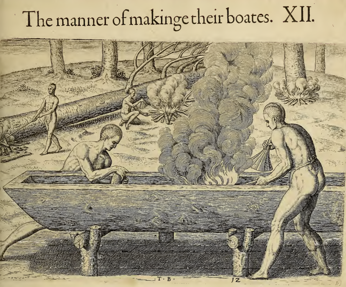 Indigenous men are shown in the process of making a canoe. The canoe they are working on is propped up on log braces. One of the men fans a fire inside the middle of the canoe while the other man scrapes the inside of one end of the canoe. In the background two other men are pictured tending to fires beside a large fallen tree, one at the base and one amongst the branches further up the trunk. There is also a fire at the base of another large tree in the background.