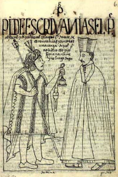 This image is illustrated in a chapter that discusses the Christian priests in the colonial government in Peru. A Spanish priest is illustrated standing on the right side of the image as he approaches an indigenous prosecutor on the left. The priest is dressed in ecclesiastic adornments and the indigenous prosecutor is dressed in a vertically embroidered unku [nightgown]. The priest approaches the indigenous prosecutor as he wishes to confiscate all writing instruments in his new parish as he feared accusations being written against him. The prosecutor is illustrated handing a scribe’s writing instruments over to the priest.