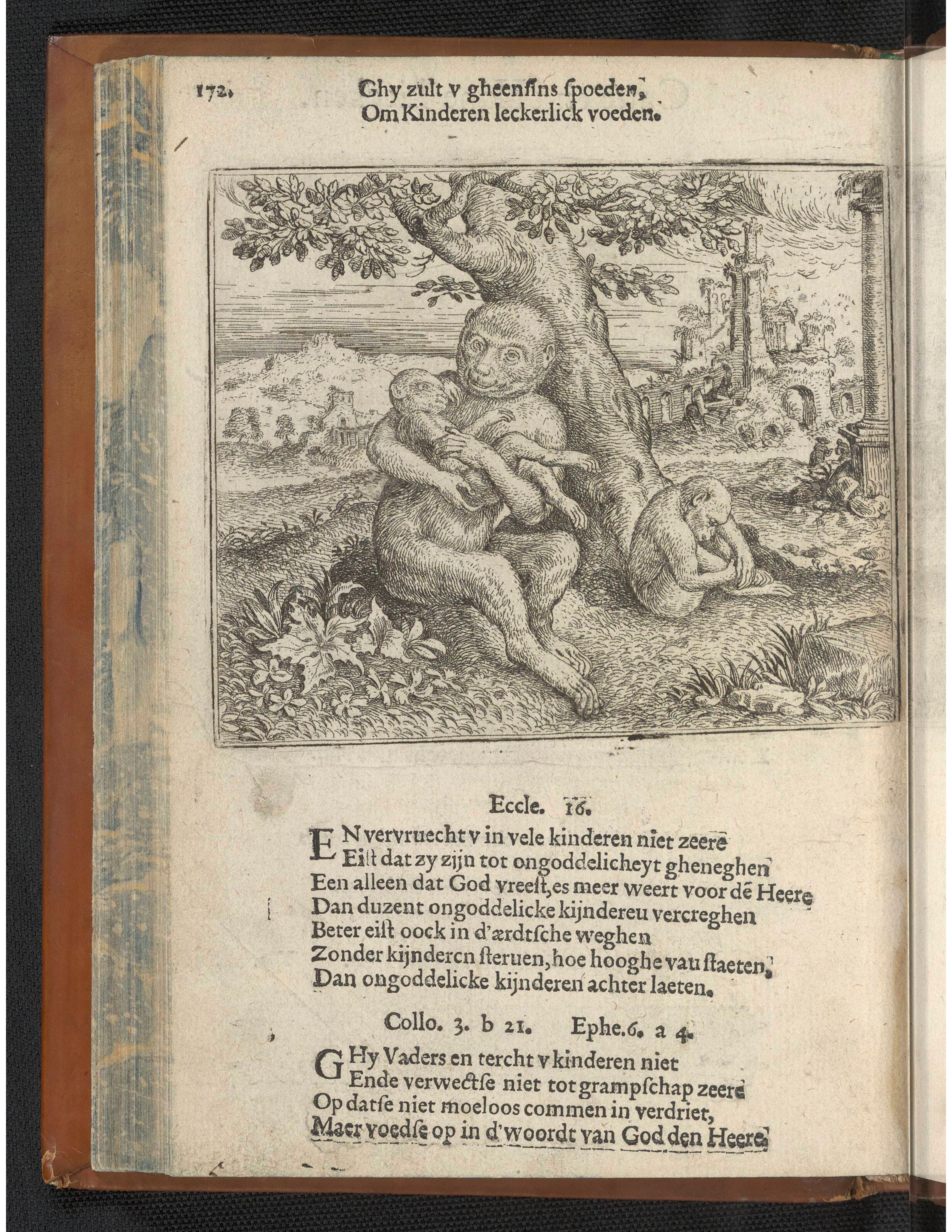 - A monkey sits under a tree with a newborn monkey in its arms; in the background a second youngster sits under the tree at right; in the upper right corner there are classical ruins.