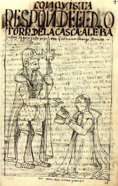 This chapter focuses on discussing the arrival of Spaniards and the Spanish conquest of Peru. This image depicts Pedro de la Gasca, the Spanish Viceroy of Peru, receiving a cleric that was sent by a conquistador named Gonzalo Pizarro. Gonzalo Pizarro rebelled against King Charles V of Spain, and Pedro de la Gasca was sent by the king to make peace with Pizarro. When Pizarro refused to co-operate, Pedro de la Gasca prepared for battle against him. Pizarro sent Gasca a cleric, as depicted in the image, to request that war not be made. The clergyman is illustrated presenting a letter and kneeling before Pedro de la Gasca. Gasca is illustrated standing in front of the clergyman with his hand reaching towards the letter. He is depicted wearing a full suit of armour and holding a long spear in his left hand. The caption at the bottom of the image reads, “en Xacxauana Pampa” [at Jaquijahuana].