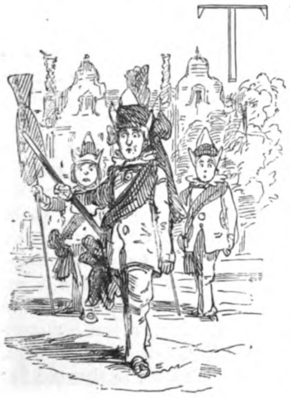 Three horned figures in sashes and pointed hats, holding poles, stand in formation before buildings with curved roofs. In the top right corner of the image is the letter T from “The”.