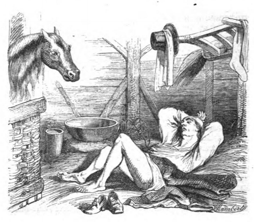 The Houyhnhnms were astonished that the only skin visible on Gulliver was on his hands and face, as the yahoos were completely naked. This served as a distinction between Gulliver and the other yahoos. It was Gulliver’s custom to undress at night and cover himself with his clothes. His master’s valet walked in on Gulliver while he was sleeping, and his clothes had fallen off and discovered that Gulliver’s body was the same as the yahoos. His master was astonished by this, and Gulliver explained how clothing worked. Gulliver asked him to keep this information to himself. The same image appears in both the 1839 and 1843 Krabbe editions.