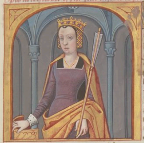 This illuminated image depicts a portrait of Opis (also called Ops). She is standing upright, wearing a crown and holding a scepter in her left hand. Boccaccio explains that Opis was the wife of Saturn, and she is renowned for having saved her children from his wrath. A prophecy had foretold that her children, Jupiter, Neptune, and Pluto would eventually defeat Saturn. To avoid this from happening, Saturn planned to kill them. Opis saved her children from her husband which is why Boccaccio wrote on her.