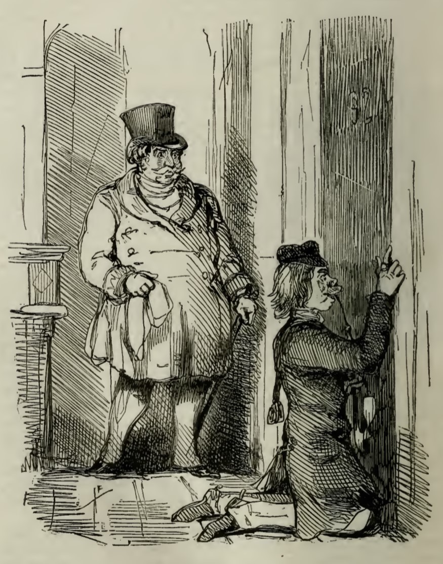 Hans kneels outside the door to Rebecca Crawley’s room at the Elephant Hotel, pleading for her to dine with him and Fitz later that day. Joseph Sedley is behind him, having just come up the stairs to see Becky, speechless in surprise.