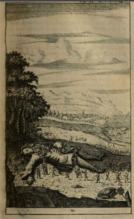The image depicts Gulliver’s first encounter with the Lilliputians. Gulliver is in the foreground, laying on the ground, tied at the wrists and ankles. There are two ladders leaning against Gulliver, one against his chest, another leaning on his leg, that the Lilliputians use to examine Gulliver. Gulliver is surrounded by the Lilliputians, who are 1/12th of his size. Several of the Lilliputians hold bows and arrows. Gulliver’s hat is on the ground by his feet. Several large trees are near Gulliver’s head. In the background, the town is visible, with the sky taking up the top third of the image.