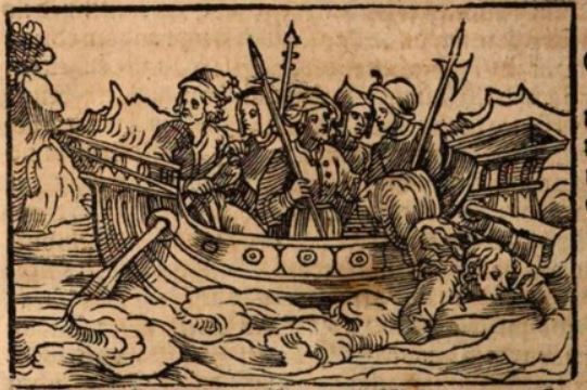 A Greek woman named Hippo had been captured by enemies, and when she heard them speaking of defiling her chastity, she decided that an early death was far better than having her honour destroyed. This engraving depicts Hippo on a boat surrounded by the men who had captured her. They are illustrated holding weapons such as lances and axes. Hippo is depicted aon the right side of the boat with her body plunging into the water. She drowned and successfully saved her honour.