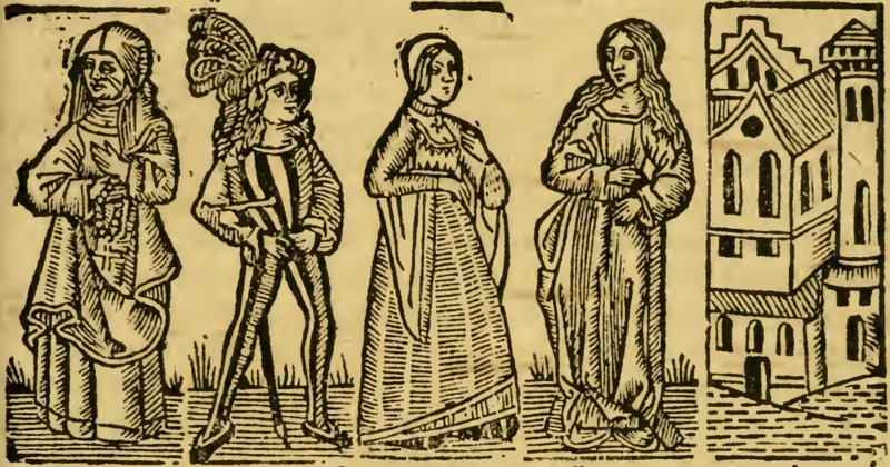 When Celestina (leftmost figure) arrives home with Pármeno (left-central figure), she tries to convince him to join her in scamming Calisto. She offers him a share of the profits and her prostitute Areusa (right-central figure), whom he loves, in exchange for his loyalty. He readily agrees, and she brings him to Areusa’s house, inducing them to spend the night together. She then returns home, where Elicia (rightmost figure) chastises her for the lateness of her arrival.[The figures in this illustration are used in multiple other illustrations throughout this edition.]