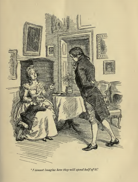 In this image we see Mr. John Dashwood and his wife, Fanny. John Dashwood was the sole inheritor of his father’s estate. He was supposed to use some of the money to support his half-sisters. Initially he was going to give them one thousand pounds, but his wife talked him out of giving them so much money. He settled on giving them a small amount of money on occasion, keeping the majority for himself and his family. This scene occurs in chapter 3. The characters are shown in the traditional regency style, as Fanny Dashwood wears the regency style dress with an empire waist. Her son is leaning on her knee. Mr. Dashwood wears a waistcoat and tailcoat with breeches and a cravat. The regency period dated to the early nineteenth century (1811-1820) when George, Prince of Wales, later George IV (r. 1820-1830), reigned as regent for his mentally ill father, King George III (r. 1760-1820). The regency period is associated with the rise of neoclassicism in art and fashion.