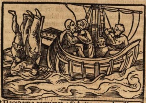 This engraving depicts Theoxena, her husband Poris, and her nephews and child killing themselves. Theoxena and her husband are depicted jumping from the ship head-first into the sea to drown themselves. They are illustrated holding each other as they die as a couple. The figures on the ship are her nephews and her son, who are also killing themselves. Theoxena had given them a choice between stabbing themselves with knives or to drink poison. Some of the children are depicted with knives in their hands as they kill themselves and one child is depicted drinking poison. Boccaccio explains that Theoxena and her family killed themselves to avoid dying at the hands of King Philip of Macedon.