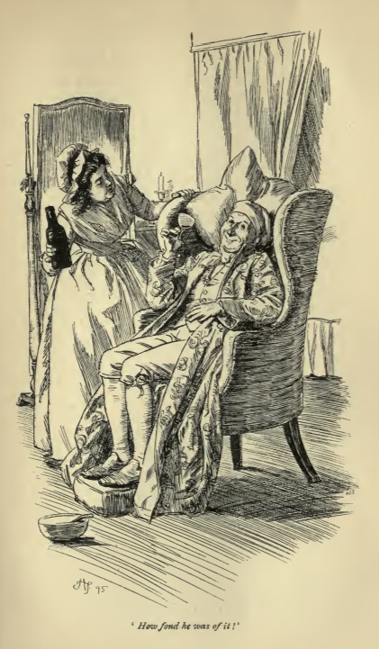 In this image Mrs. Jennings gives her ill husband a glass of her best Constantia wine. Mr. Jennings died before the beginning of the novel, but Mrs. Jennings spoke about him when caring for Marianne. After Marianne found out about Willoughby’s engagement, she was distraught. Mrs. Jennings was trying to care for her and brought out a glass of a special Constantia wine that always helped her husband when he was ill. Elinor told her that Marianne was already in bed but said she would drink it herself. This scene occurs in chapter 30. The characters are shown in the traditional regency style, as Mrs. Jennings wears the regency style dress with an empire waist. She has a mop cap to cover her hair and apron to protect her clothes. Her husband wears a waistcoat and breeches with a housecoat and nightcap. The regency period dated to the early nineteenth century (1811-1820) when George, Prince of Wales, later George IV (r. 1820-1830), reigned as regent for his mentally ill father, King George III (r. 1760-1820). The regency period is associated with the rise of neoclassicism in art and fashion.