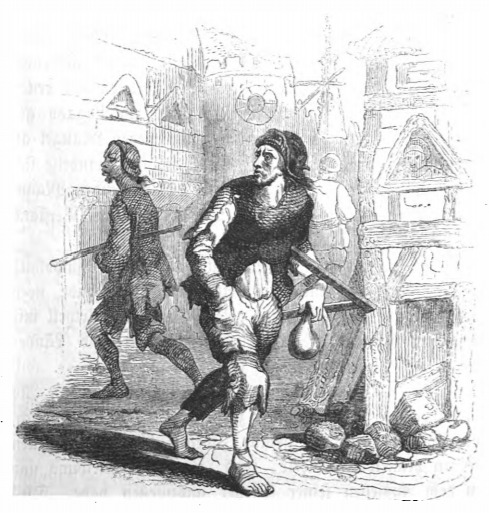 Gulliver left the floating island of Laputa to go to Balnibarbi. He arrives and goes into the city of Lagado. He says it is about the size of London, however, most of the buildings had fallen into disrepair. The people often wore rags, walking quickly through the streets. There was also a distinct lack of agriculture despite the good quality of the land. In this image we see some of the locals of Balnibarbi walking through the streets. In the background we see houses that are falling apart. For example, on the right hand side we see a house whose walls are not straight, but are bowing out, and rubble underneath the window. The same image appears in the 1839 Krabbe edition.
