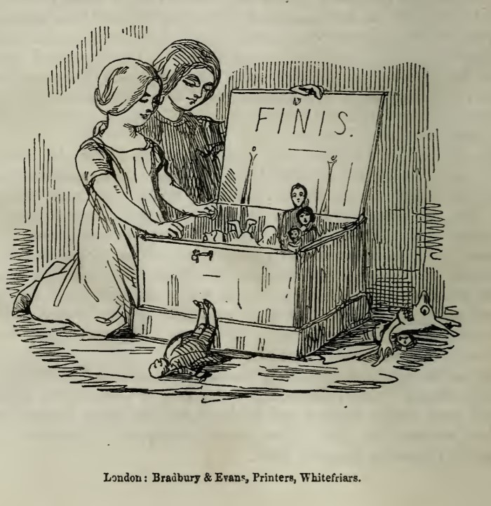 Two girls kneel next to a toy chest, the lid of which is engraved with “FINIS”. It contains assorted items, including a set of dolls in the forms of Dobbin, Amelia, and Georgy, and on the ground beside it one of Jos, Becky, and a devil. Beneath the image is printed the publisher’s information, “London: Bradbury & Evans, Printers, Whitefriars.”