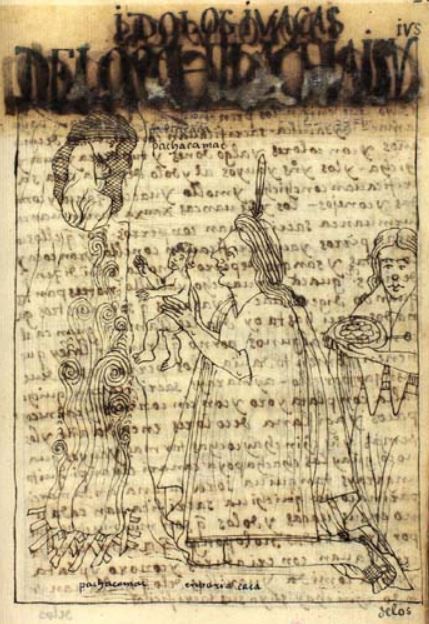 This chapter is dedicated to describing the idols and gods of the Incas. This image depicts the Inca king performing a sacrifice of a young child to the deity Pachacamac. Pachacamac is depicted in the top left corner of the image looking down to the Inca. There is a fire burning below the deity which is being used to sacrifice the child. There is a woman standing behind the Inca holding a plate of food, which was also sacrificed to the deity. The word Pachacamac is written beside the deity to identify it. The words “en Paria Caca” are written at the bottom of the image to identify where this image is taking place, which is in Pariacaca.