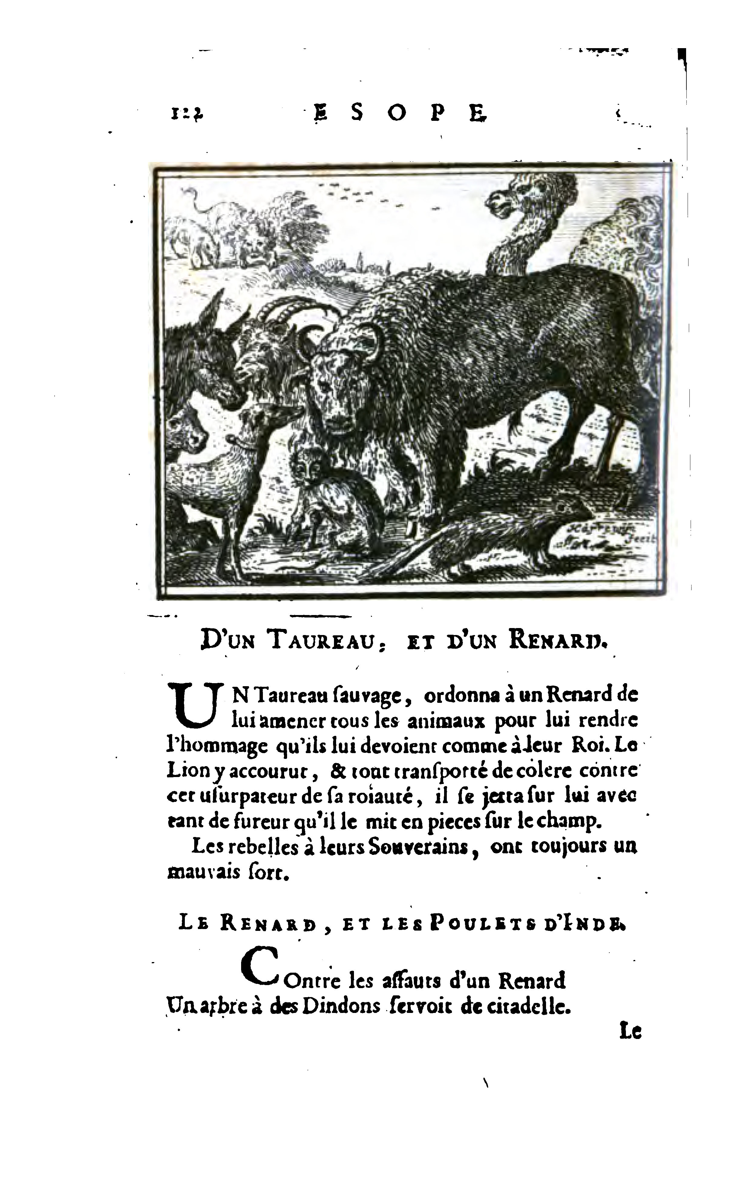 A bull orders a fox to bring him all of the animals that think of him as their king. Upon hearing this a lion becomes angry over his power being threatened, and runs up, throws himself onto the bull with great rage, and tears the bull to peices. Rebels against their rulers, always face a terrible fortune.
