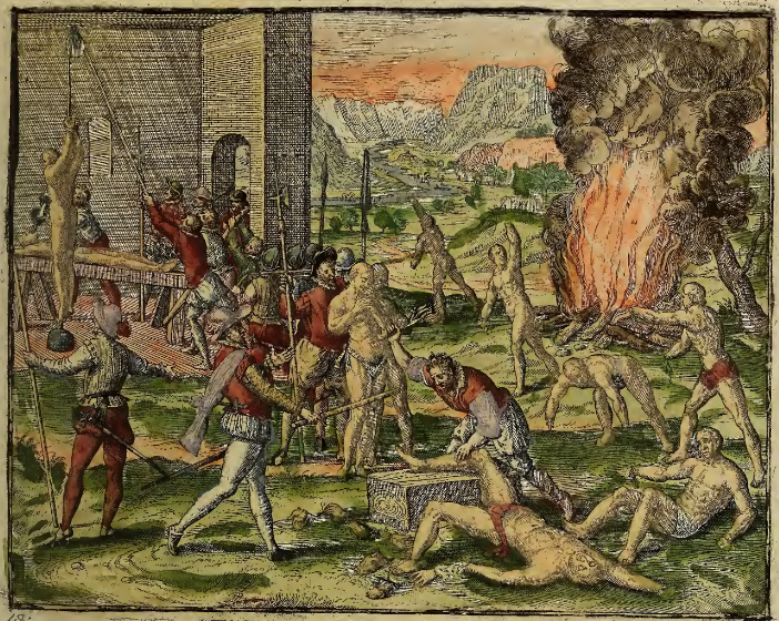 Hernando de Soto was a Spanish man who governed the Spanish territories of Cuba and La Florida (a large area of the modern Southern United States, including the present-day state of Florida) from 1536 to his death in 1542. Here, he and several fellow Spaniards torture and kill Indigenous people in Florida. In the foreground, an Indigenous man lays on the ground with one leg raised on a wooden block while a Spaniard holds a weapon poised over his raised leg. The Indigenous man has already lost both hands, and several other Indigenous people nearby have also had their hands cut off by the Spanish. Several severed limbs lay on the ground. To the left, an Indigenous man has been hung inside a structure while several Spaniards watch. Another Indigenous man has been tied down on his back on a wooden table while a Spanish man pours a liquid into his mouth using a funnel. A large fire burns on the right. This image is identical to one found on page 151 of Frankfurt, 1595, but colored.