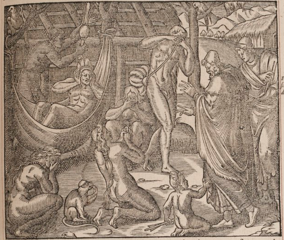 A group of Indigenous men, women, and children cry of happiness, some with their hands over their faces or clasped in front of them in displays of emotion. One man sits in a hammock, while two others stand around him, and three women and a child crouch or kneel on the ground. Two European men stand beside the group, dressed in long robes with caps on their heads. The child sits on the ground near the feet of one of the men and pulls on the bottom of his robes with one hand. Two structures are visible, one directly behind the group and another in the distance. This image is identical to one found on page 929 of Paris, 1575 (l’Huillier).