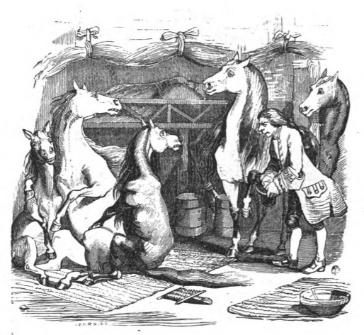 Here we see Gulliver's introduction to the Houyhnhnms who took Gulliver in. The Gray horse who found Gulliver brought him to an authority of the Houyhnhnms. He introduced Gulliver to a mare with a colt and foal, sitting on mats woven out of straw. The same image appears in both the 1839 and 1843 Krabbe editions.