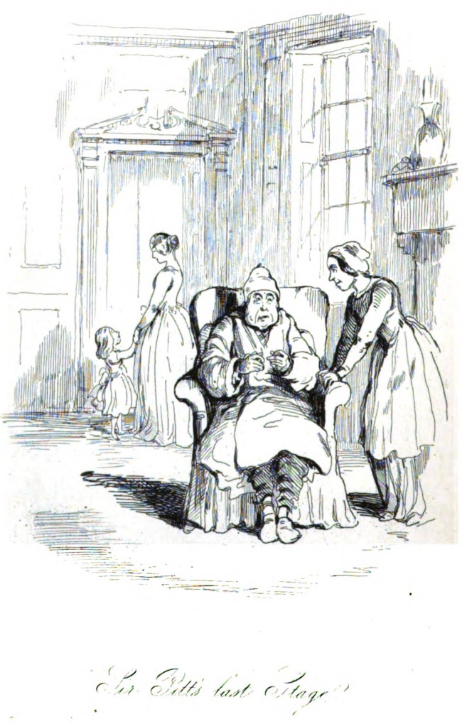 Sir Pitt Crawley, in a nightcap, sits in the chair in front of the fireplace in his apartments. Behind him, Lady Jane Crawley and her daughter, Matilda Crawley, are holding hands as they leave the room. Next to Sir Pitt, Miss Hester, now his nurse, has turned his chair away from the fire with a scowl on her face. Below the illustration is printed in cursive its title, “Sir Pitt’s last Stage.”