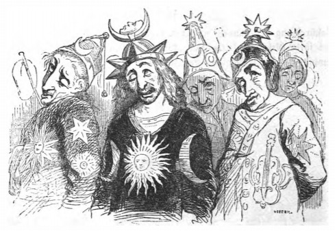 Here we see three Laputan scholars attended by their Flappers. The Laputans were so deep in thought they could not speak. The Flapper was a servant who carried a blown bladder filled with peas or pebbles and was used to communicate. The Flapper attended the wealthy scholars and when they wanted to converse with one another, they would gently tap the bladder on the mouth of one person then on the ear of another. Because the scholars could get so wrapped up in what they were thinking about, they would stop what they were doing or seemingly stop seeing anything around them. The Flapper would then tap their eyes to help remind the scholars of what they were doing. Thus, the Flappers were there to help the scholars through their daily life. In this image we see three scholars in the front, lost in thought, with their Flappers behind them. On the far left, we can see the bladder used by the Flapper. The Laputans wear clothes and hats with astronomical and musical motifs. The Laputans’ faces were not symmetrical, with their heads tilting to one side, and one eye turning inwards and the other looking straight up. The same image appears in the 1839 Krabbe edition.